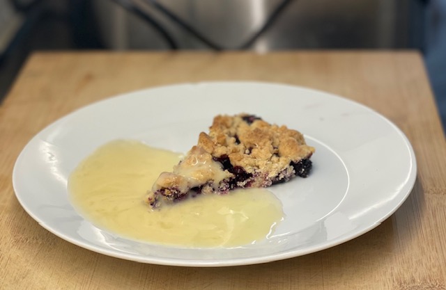 3. Blanda blåbären med potatismjöl och socker. Bred ut fyllningen i botten på formen.