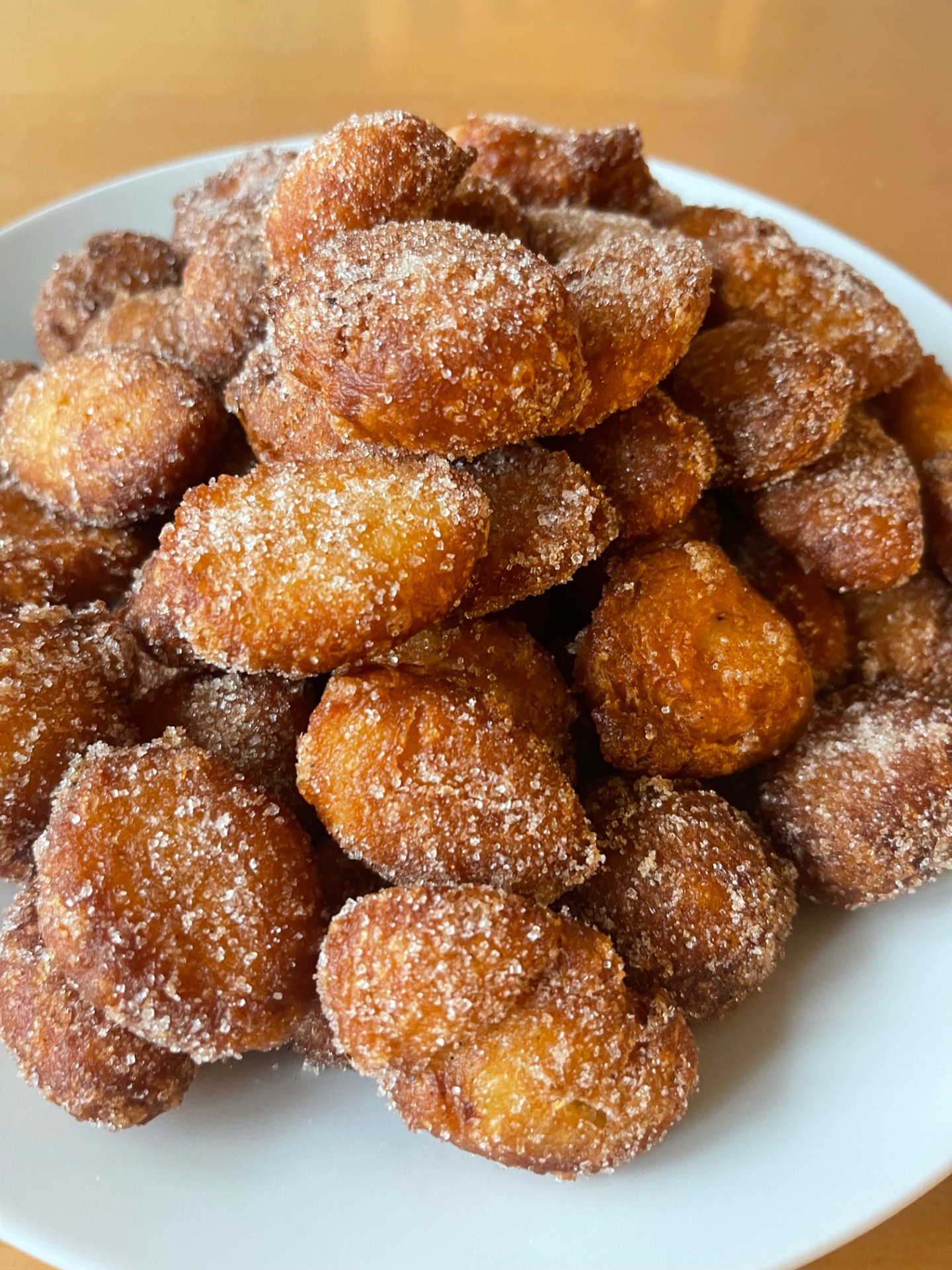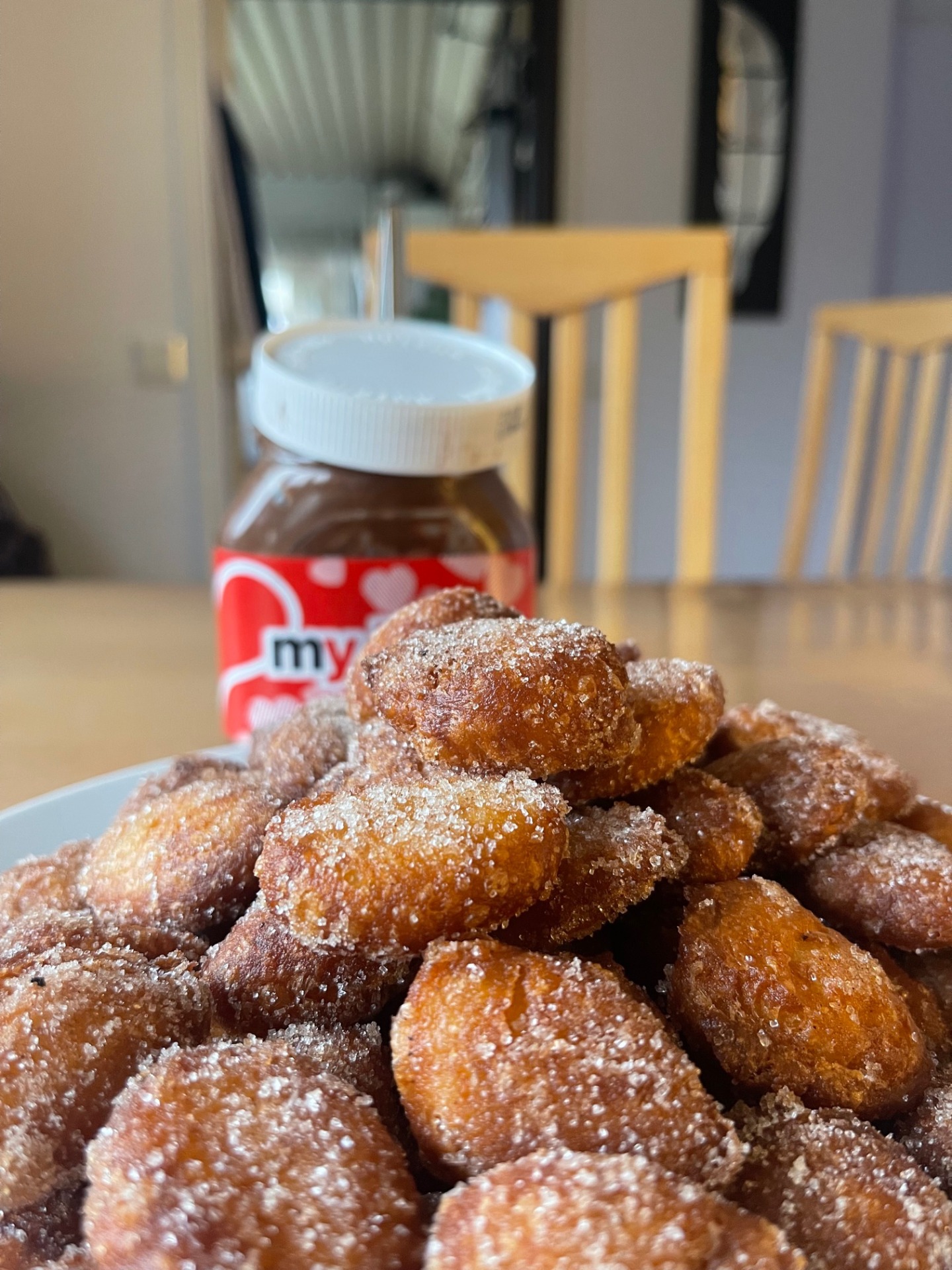 3. Häll smeten i en spritspåse och spritsa ut i en kastrull med olja. Alternativt forma degen till "bollar" och fritera dessa istället, om det blir lättare. Fritera på 160-180 grader, tills de blivit klara inuti och fått en fin gyllene färg på utsidan.