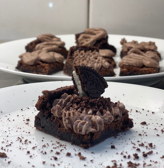 5. Spritsa ut frostingen på kladdkakan och dekorera med mini oreos/oreosmul.