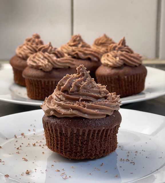 10. Häll grädden i en spritspåse och spritsa ut på varje muffins. Garnera med riven choklad.