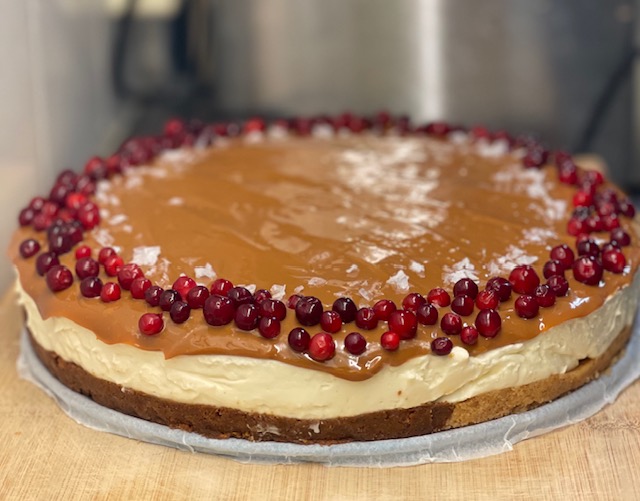 (Receptet kommer från Camilla Hamid, men jag gjorde min cheesecake-botten med hälften digestivekex och hälften pepparkakor, och dessutom använde jag färdig dulce de leche (karamelliserad mjölk) istället för att koka min egna kola.)