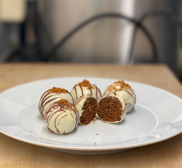 4. Smält den vita chokladen och låt svalna en aning innan du doppar dina pepparkaksbollar i den.
