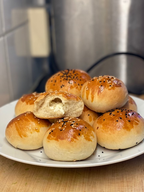 7. Forma degen till små bollar, lite mindre än en clementin. Platta ut bollarna och fylld med den vita osten. Rulla ihop till en boll igen.