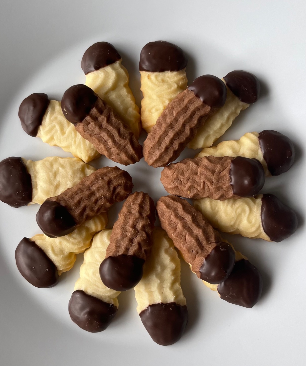 8. När chokladen har smält och svalnat kan du doppa änden av kakorna i chokladen. Låt sedan svalna i kylen.