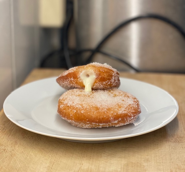 11. Gör ett jack i ena änden av munkarna med hjälp av en kniv. Spritsa i vaniljkrämen.